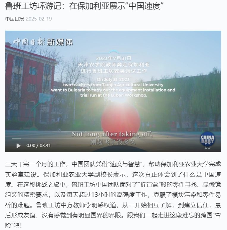 2025年2月19日,学习强国平台-中国日报报道,我校教师团队帮助保加利亚农业大学完成实验室建设。