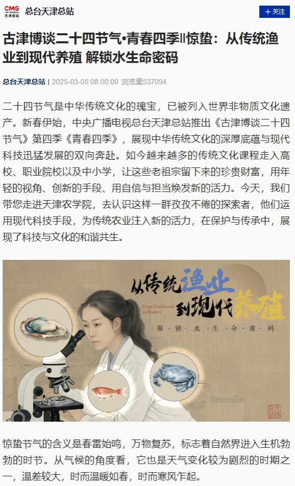 2025年3月5日,中央广播电视总台天津总站《古津博谈二十四节气》第四季《青春四季》报道我校水产学院师生运用现代科技手段,为传统渔业注入新的活力,在保护与传承中,展现了科技与文化的和谐共生。