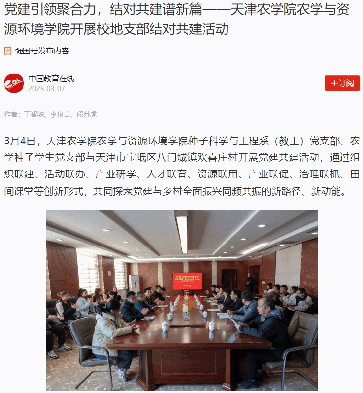 2025年3月7日,学习强国平台-中国教育在线、中国教育在线网报道,我校农学与资源环境学院种子科学与工程系(教工)党支部、农学种子学生党支部与天津市宝坻区八门城镇欢喜庄村开展党建共建活动,通过组织联建、活动联办、产业研学、人才联育、资源联用、产业联促、治理联抓、田间课堂等创新形式,共同探索党建与乡村全面振兴同频共振的新路径、新动能。