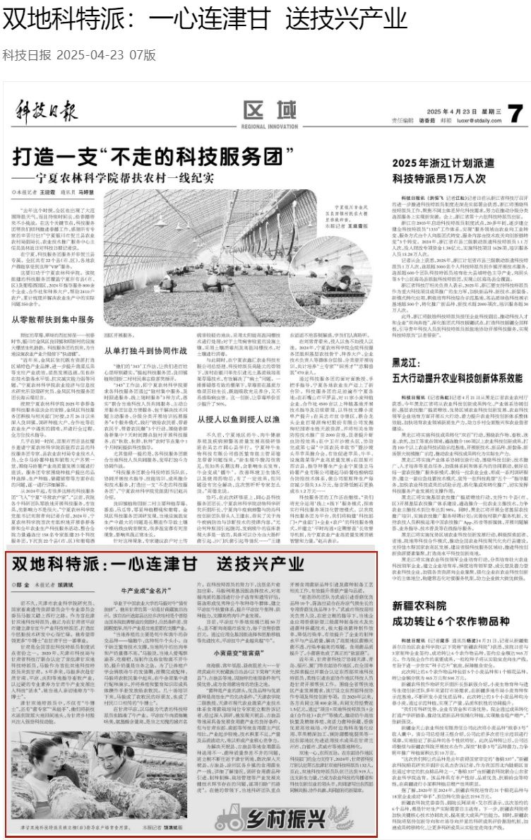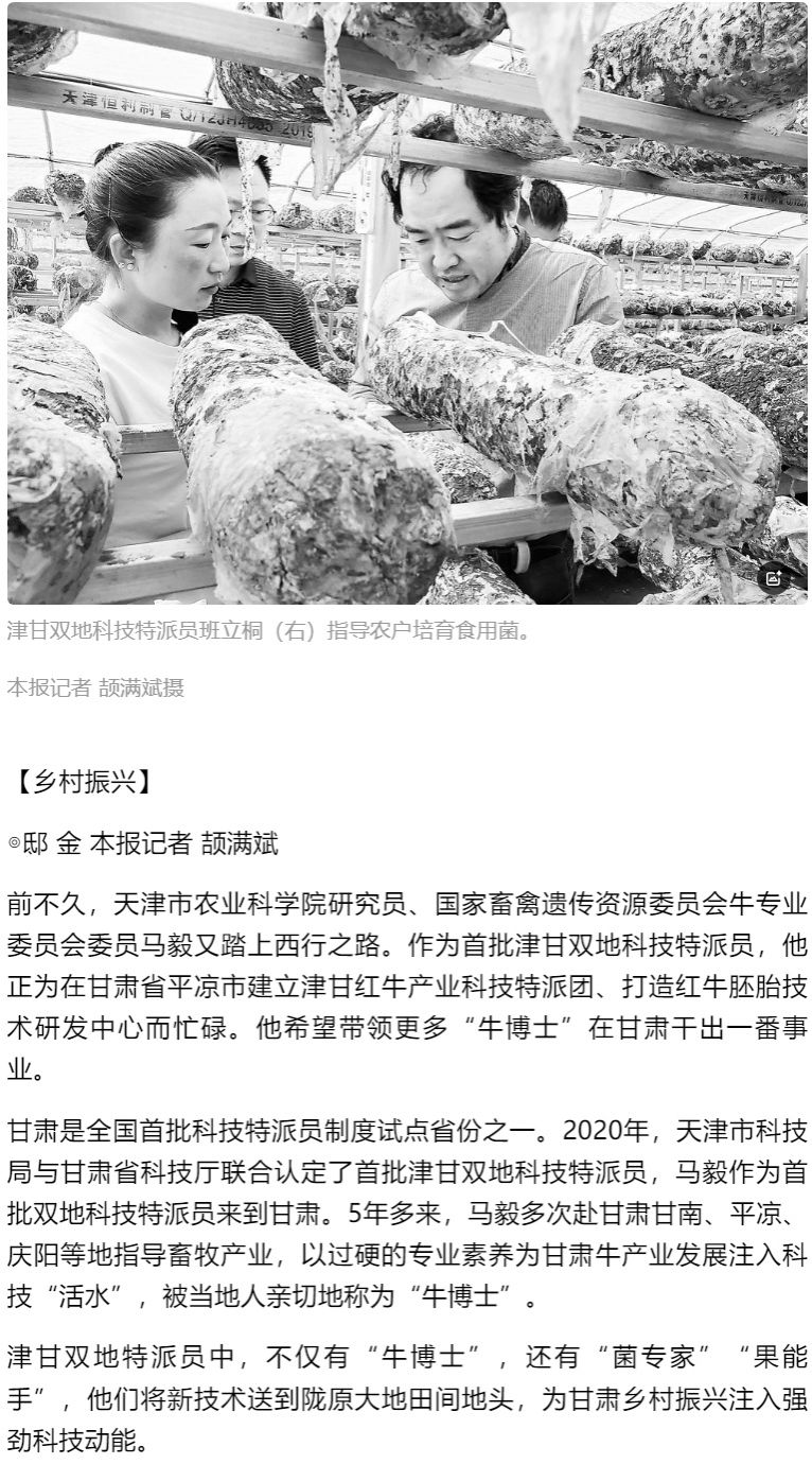 2025年4月23日,《科技日报》第07版报道,天津市现代农业蔬菜产业技术体系食用菌栽培岗位专家、津甘双地特派员、我校班立桐教授不断往返于津甘两地,调研食用菌品种引进、制种制棒、栽培管理等产业发展关键技术环节存在的问题,逐项扫除“拦路虎”。在他的带领下,当地科研团队重点开展食用菌新品种引进及菌种制备工艺相关工作,有效提升香菇产量与品质。