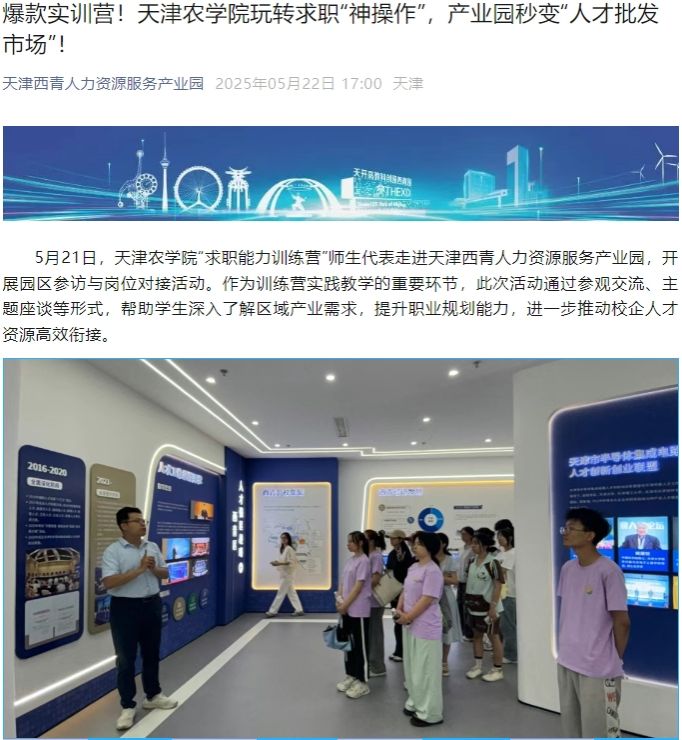 2025年5月22日,天津西青人力资源服务产业园公众号报道,我校“求职能力训练营”师生代表走进天津西青人力资源服务产业园,开展园区参访与岗位对接活动。作为训练营实践教学的重要环节,此次活动通过参观交流、主题座谈等形式,帮助学生深入了解区域产业需求,提升职业规划能力,进一步推动校企人才资源高效衔接。