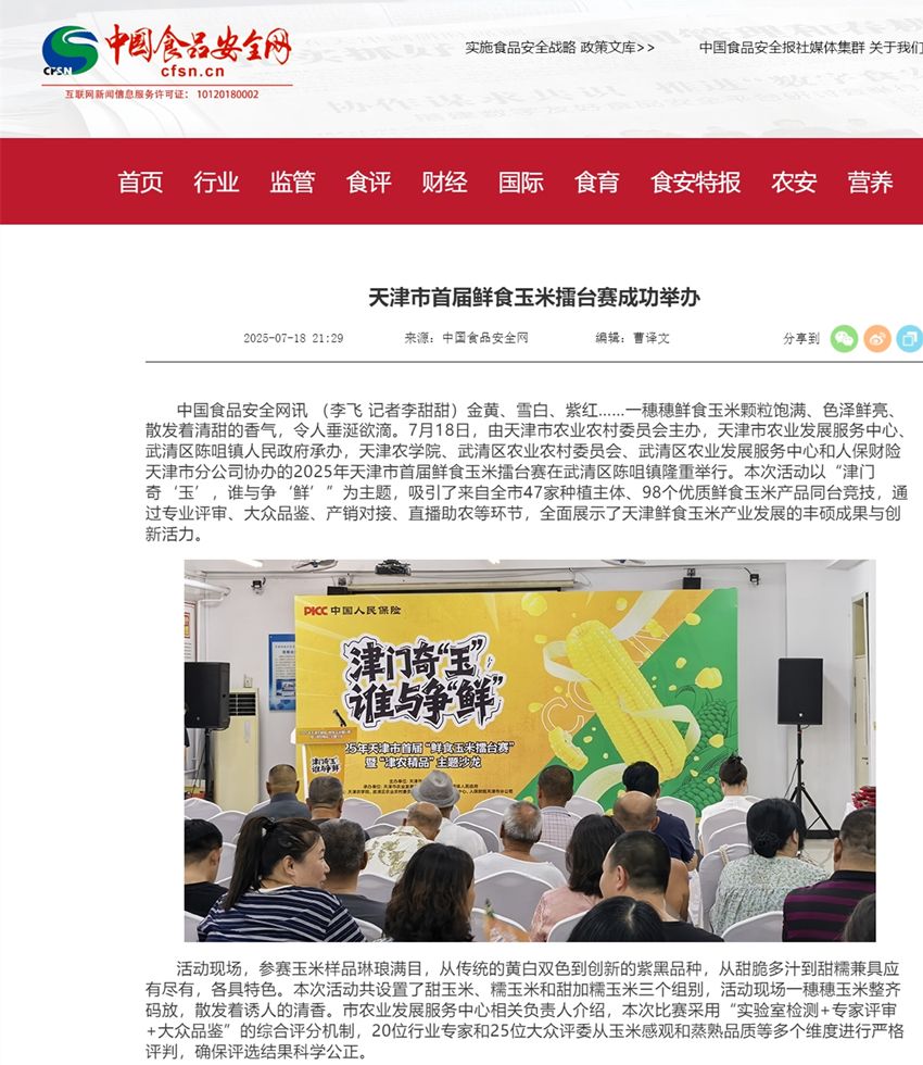 2025年7月18日-20日,中国食品安全网、津云、食安天津公众号、美丽武清公众号等多家媒体报道,2025年天津市首届鲜食玉米擂台赛鸣锣开擂。我校的甜玉米品种凭借出众的外观和口感,摘得“甜玉米”组别桂冠。同时,我校的参赛样品获得“最受大众欢迎奖”。