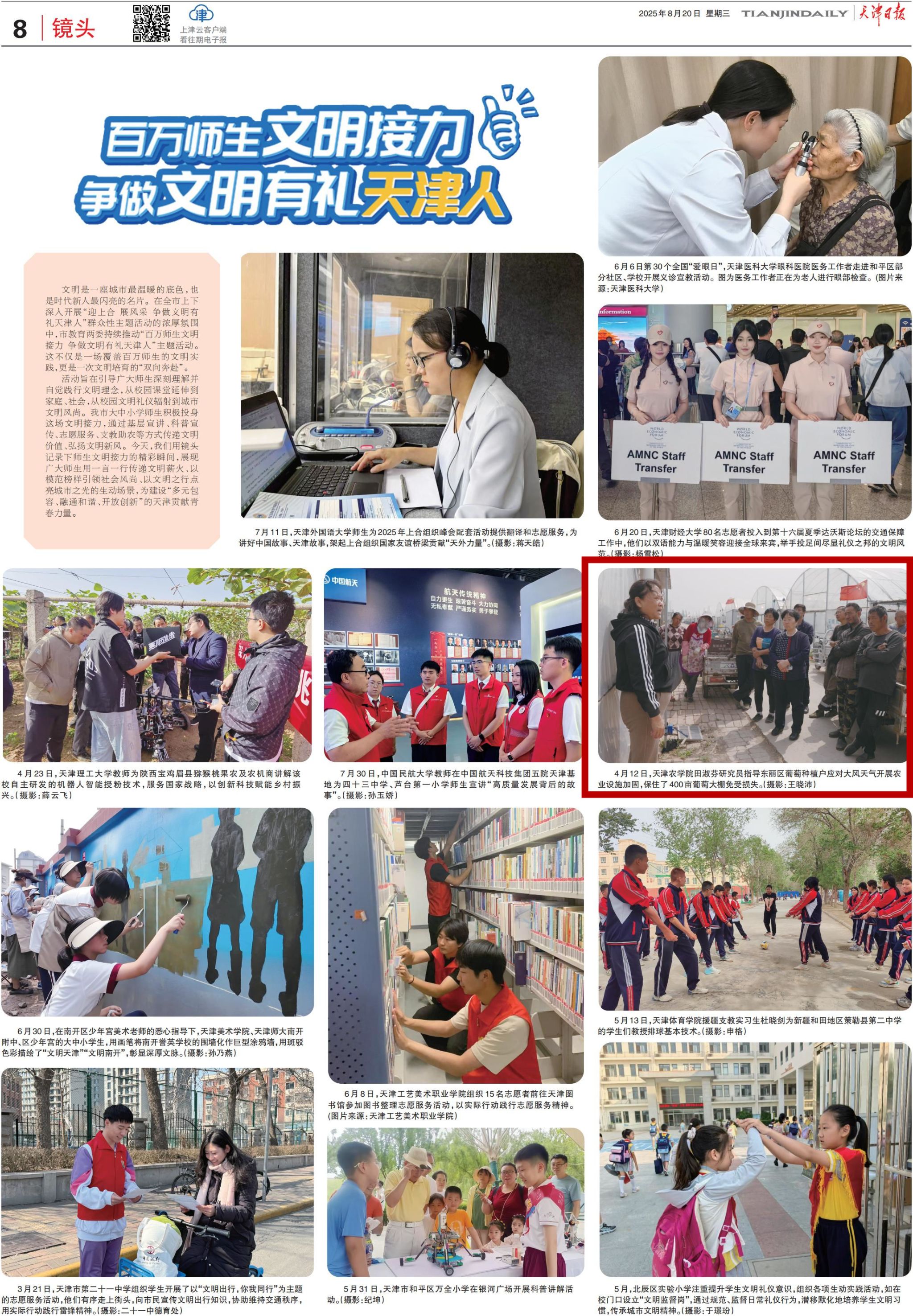 2025年8月20日,《天津日报》以《百万师生文明接力 争做文明有礼天津人》为题,用镜头记录了我校园艺园林学院田淑芬研究员指导东丽区葡萄种植户应对大风天气开展农业设施加固,保住了400亩葡萄大棚免受损失的精彩瞬间。