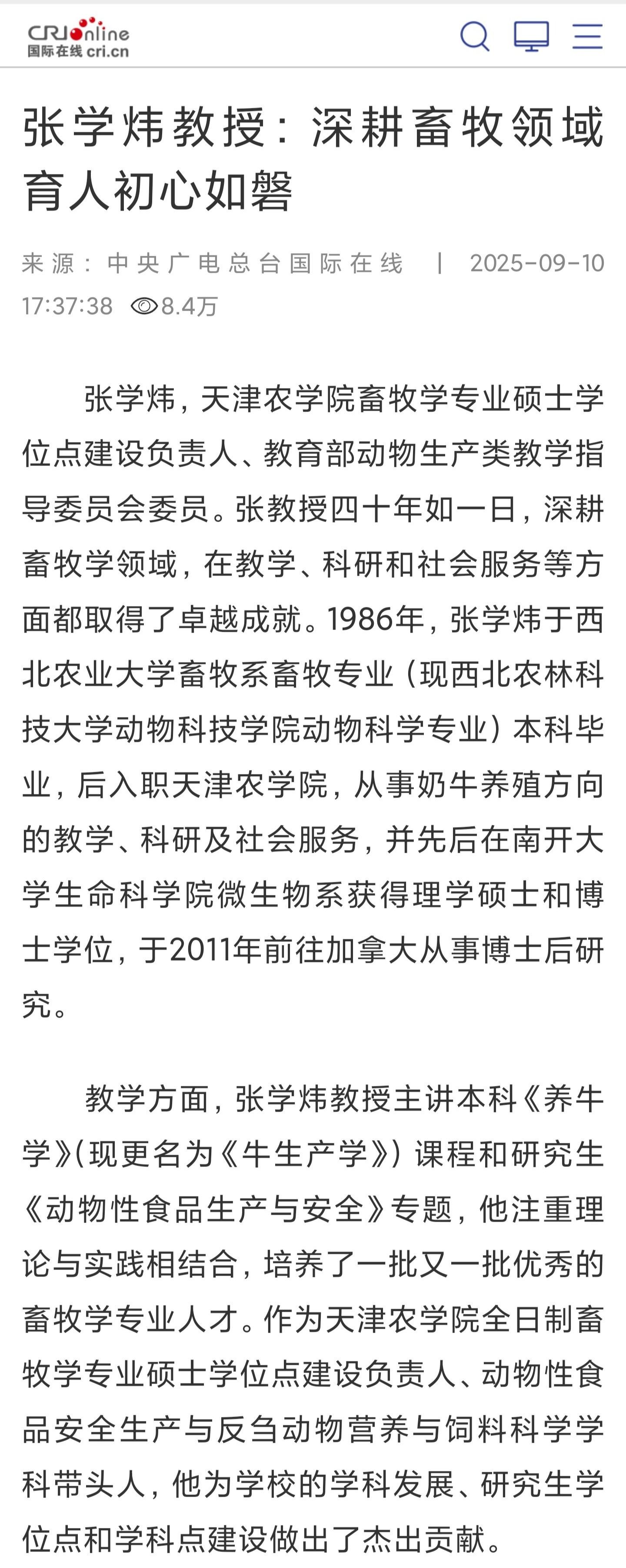 2025年9月10日,中央广播电视总台国际在线报道我校动物科学与动物医学学院张学炜教授四十年如一日,深耕畜牧领域,育人初心如磐。