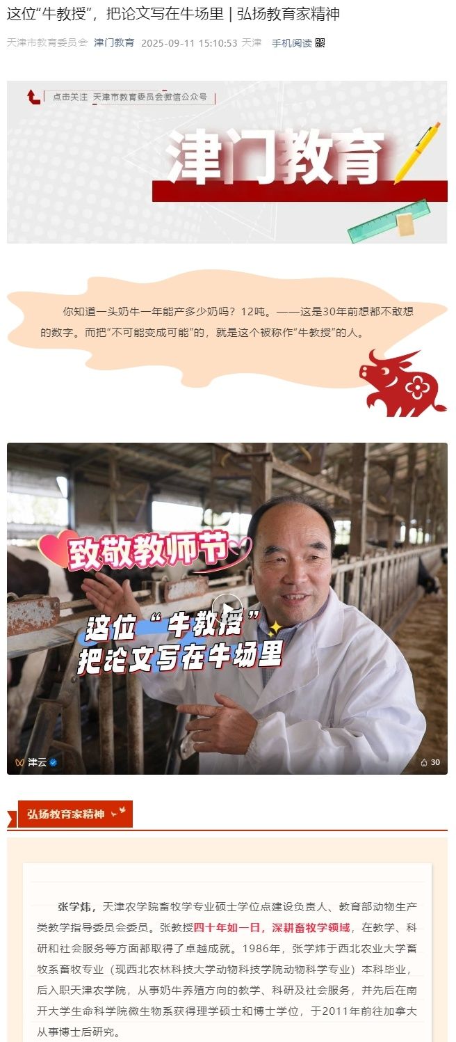 2025年9月11日,津门教育报道我校动物科学与动物医学学院张学炜老师教书育人工作。