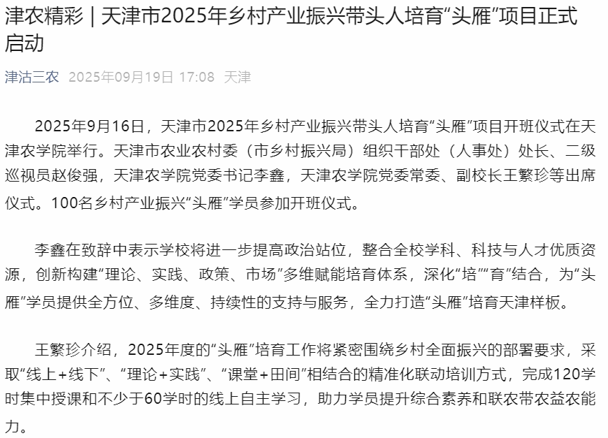 2025年9月19日,津沽三农公众号报道天津市2025年乡村产业振兴带头人培育“头雁”项目开班在我校举行。