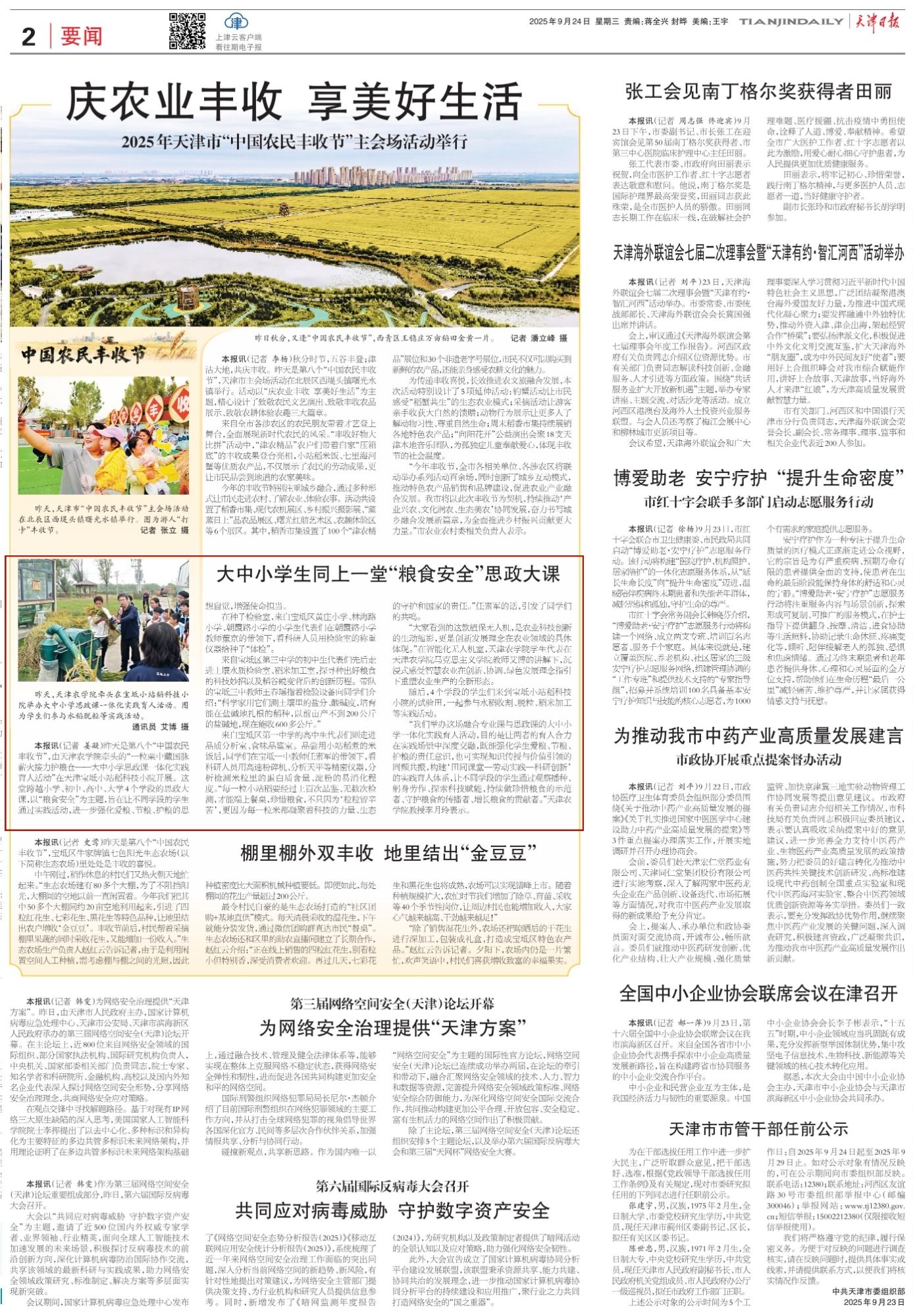 2025年9月24日,《天津日报》第02版报道,由我校牵头的“一粒粟中藏国脉 薪火接力护粮仓——大中小学思政课一体化实践育人活动”在天津宝坻小站稻科技小院开展。