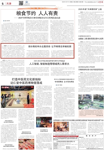 2025年10月17日,《天津日报》报道,我校发起并联合北京农学院、河北农业大学共同举办“思源奋进·珍惜粮食我示范”主题实践课,以贯彻落实国家粮食安全战略,增强师生粮食安全意识、爱粮节粮的思想自觉和行动自觉。