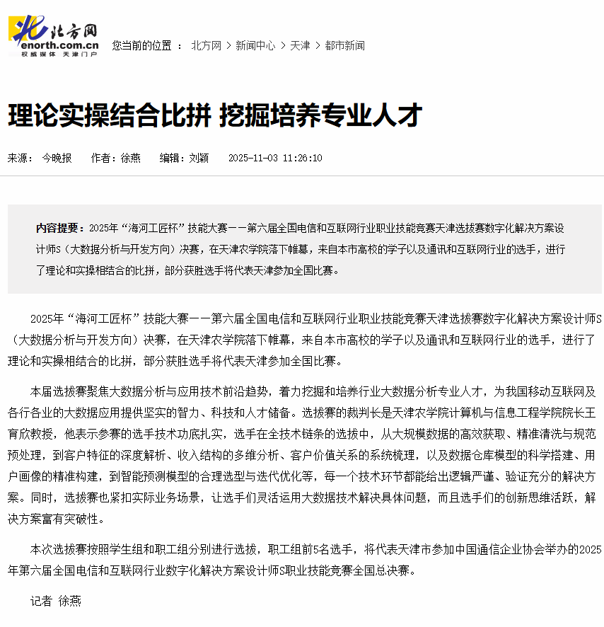 2025年11月3日,北方网报道,2025年“海河工匠杯”技能大赛——第六届全国电信和互联网行业职业技能竞赛天津选拔赛数字化解决方案设计师S(大数据分析与开发方向)决赛,在我校落下帷幕,来自本市高校的学子以及通讯和互联网行业的选手,进行了理论和实操相结合的比拼,部分获胜选手将代表天津参加全国比赛。