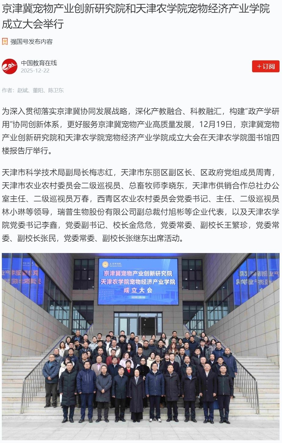 2025年12月22日,学习强国平台、中国教育在线网报道,京津冀宠物产业创新研究院和威客电竞宠物经济产业学院成立大会在我校图书馆四楼报告厅举行。
