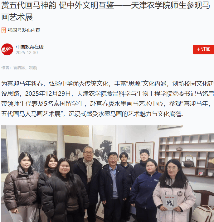 2025年12月30日,学习强国平台、中国教育在线网报道,我校食品科学与生物工程学院党委书记马铭启带领师生代表及5名泰国留学生,赴宫春虎水墨画马艺术中心,参观“喜迎马年,五代画马人马画艺术展”,沉浸式感受水墨马画的艺术魅力与文化底蕴。