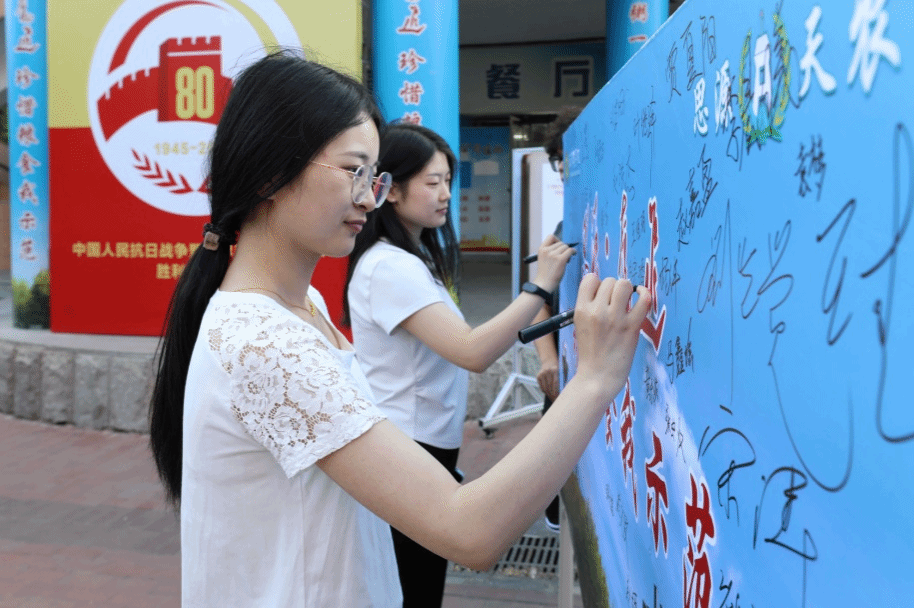 活动在集体签名中推向高潮。师生们郑重地在印有“思源奋进,珍惜粮食我示范”主题签字板上签名承诺。一个个签名不仅凝聚了大家守护粮食安全的决心,更将成为校园内靓丽的文明风景线。随后,在场师生共同参观了主题图片展,共同回顾了中国共产党团结带领各族人民走过的苦难与辉煌,带给中华民族的光荣和梦想。