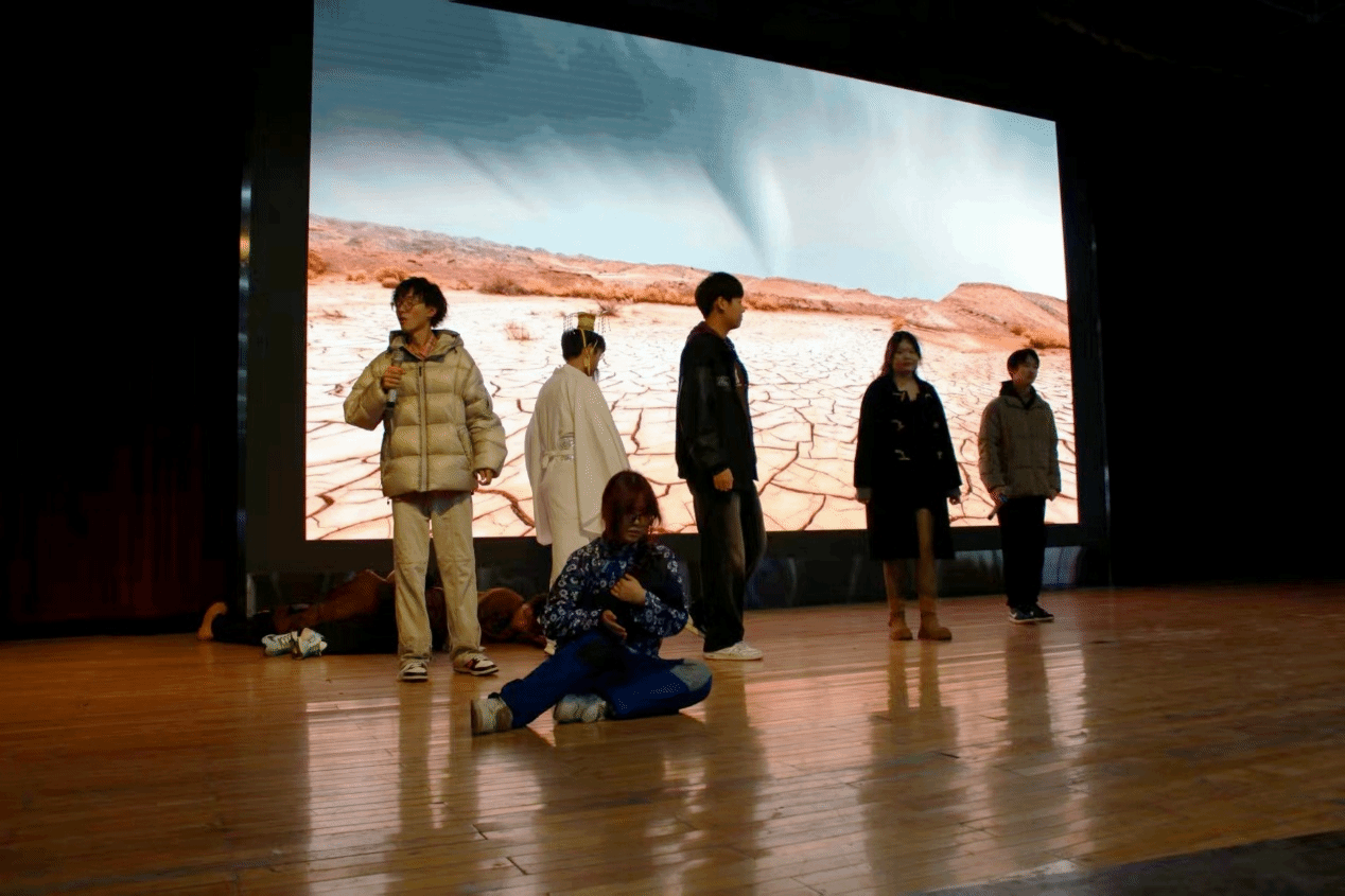 同学们全情投入,用真挚饱满的表演诠释对粮食的珍视之情。道具制作细致精巧,从模拟田间劳作的农具到还原日常用餐的餐具,处处贴合生活场景;台词朴实生动,将 “一粥一饭当思来处不易” 的理念融入其中,句句传递节粮心声。精彩的演绎赢得现场观众的阵阵掌声,氛围热烈而浓厚。同学们创新采用沉浸式表演形式,一边细腻复刻古代农耕场景,再现先辈们面朝黄土背朝天的辛劳与对粮食的敬畏;一边畅想科技赋能下粮食节约与可持续发展的新路径。整场表演带领大家跨越时空维度,深刻感受粮食的珍贵价值,在古今文明的碰撞与未来图景的畅想中,让 “思源节粮” 文化深入人心,进一步深化了全体参与者的节粮自觉与责任担当。