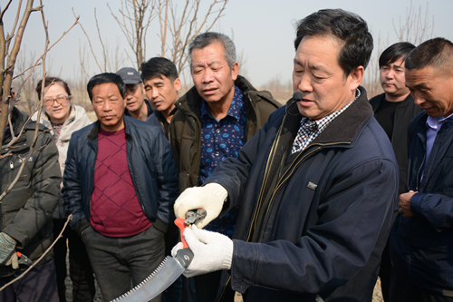 孟庆田教授跟随农民来到了学郝铺村皇冠梨的种植基地,示范如何正确修剪梨树。通过现场实践,孟教授为果农讲解修剪的原理和诀窍。经过他的多次示范,每位果农都基本掌握剪枝技术。现场,果农们又追着问了其他种植问题,有果农问自家的果树被火烧是否还能存活,为了准确了解果树的情况,孟教授还专门前往查看果树被烧情况,为果农解决问题。